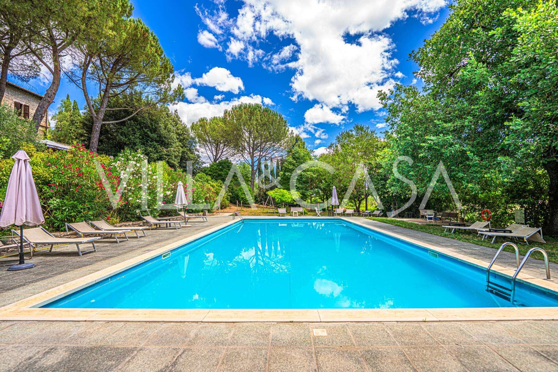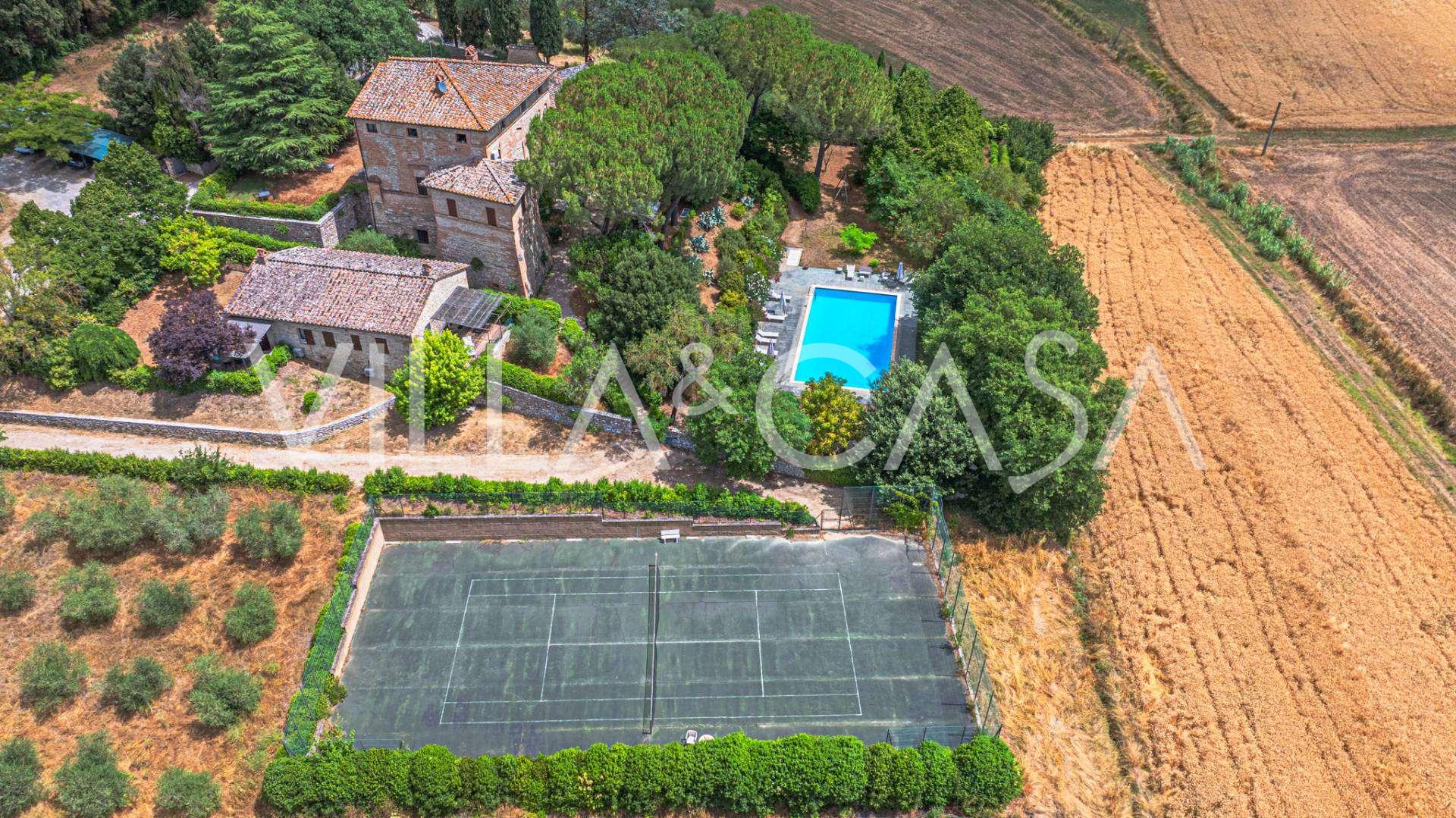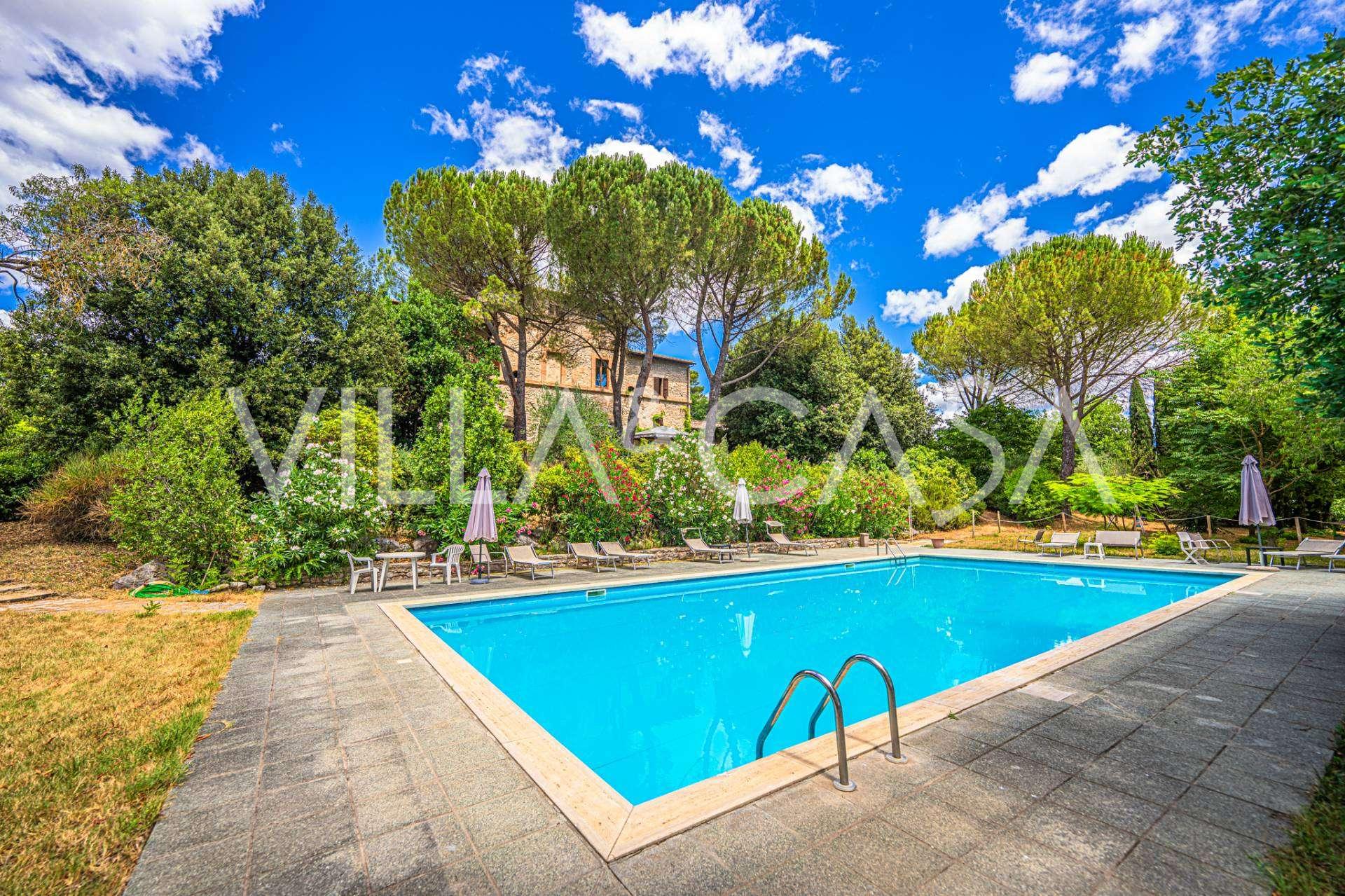 Een duizendjarige residentie van 1100 m², omgebouwd tot een elegant agritoerisme met 10 appartementen en 20 slaapkamers, een park, zwembad en tennisbaan, is te koop in Perugia.
