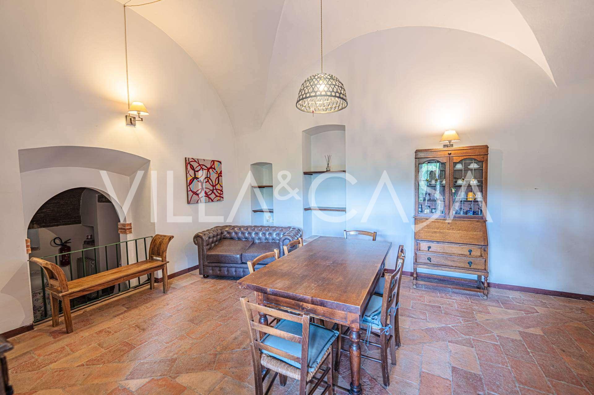 De interieurs van de villa dragen de sporen van duizend jaar geschiedenis: gewelfde plafonds met charmant metselwerk of balken van natuurlijk hout in traditionele rustieke stijl. De vloeren zijn volledig bedekt met handgemaakte terracotta tegels. In sommige kamers zijn oude muurschilderingen, altaren en nissen bewaard gebleven.